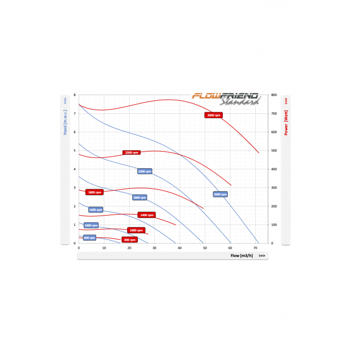 Die normale FlowFriend hat ein sog. Mixed-Flow-Pumpengehäuse, eine Form, die auch häufig in Schöpfwerken zur Anwendung kommt. Der optimale Einsatzbereich liegt zwischen 1 und 5 Metern Förderhöhe. Die Hydraulik wurde so konstruiert, dass mehr Druck zur Verfügung steht als bei einer Flügelradpumpe. Dabei wird im Vergleich zu anderen Pumpen bei gleicher Kapazität wesentlich weniger Energie verbraucht. Fast alle Pumpen mit hoher Kapazität weisen mehr als 10 m Druck auf. Dieser hohe verfügbare Druck verbraucht viel Energie. Bei einem etwas höheren Gegendruck durch z.B. längere Rohre, viele Krümmungen und Höhenunterschied ist die “Standard”-FlowFriend die optimale Wahl. Die FlowFriend hat sowohl an der Saug- als auch an der Druckseite einen 3”-Gewindeanschluss.