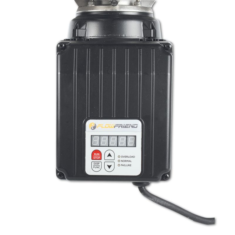 Standardmäßige Drehzahlregelung (600-2550 U/min) bei jedem FlowFriend-Typ. Zur Regelung befindet sich auf der Pumpe ein Display, auf dem auch die Leistung und die Zahl der Betriebsstunden angezeigt werden. Über einen optionalen 0-10 V-Eingang kann jede FlowFriend-Pumpe auch extern gesteuert werden.