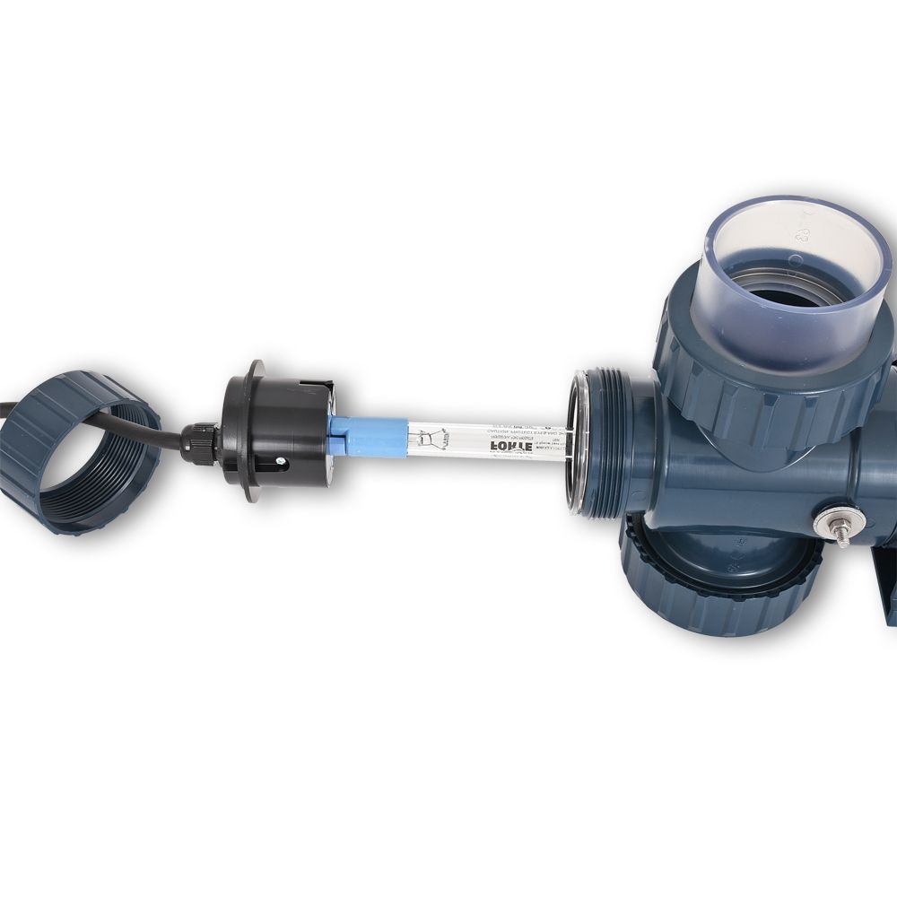 Außerdem wird das Gerät komplett mit Lampe, Transformator und Quarzglas geliefert, was die Installation noch einfacher macht.