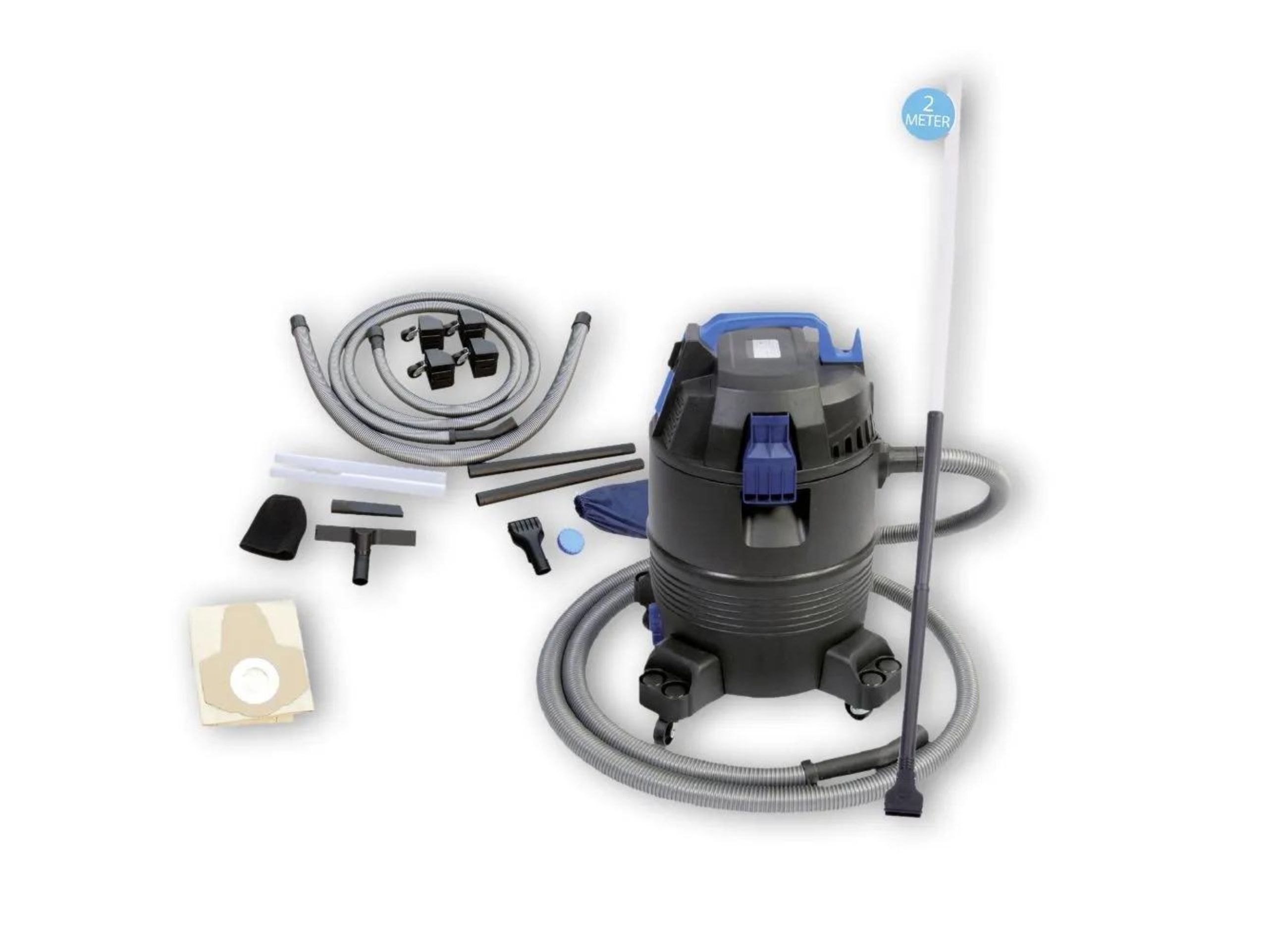 • Inkl. 3 verschiedenen Saugdüsen, 4 m Saugschlauch, 4 x 50 cm Saugrohr, 1,5 m Ablaufschlauch und 1 x Staubsaugerbeutel