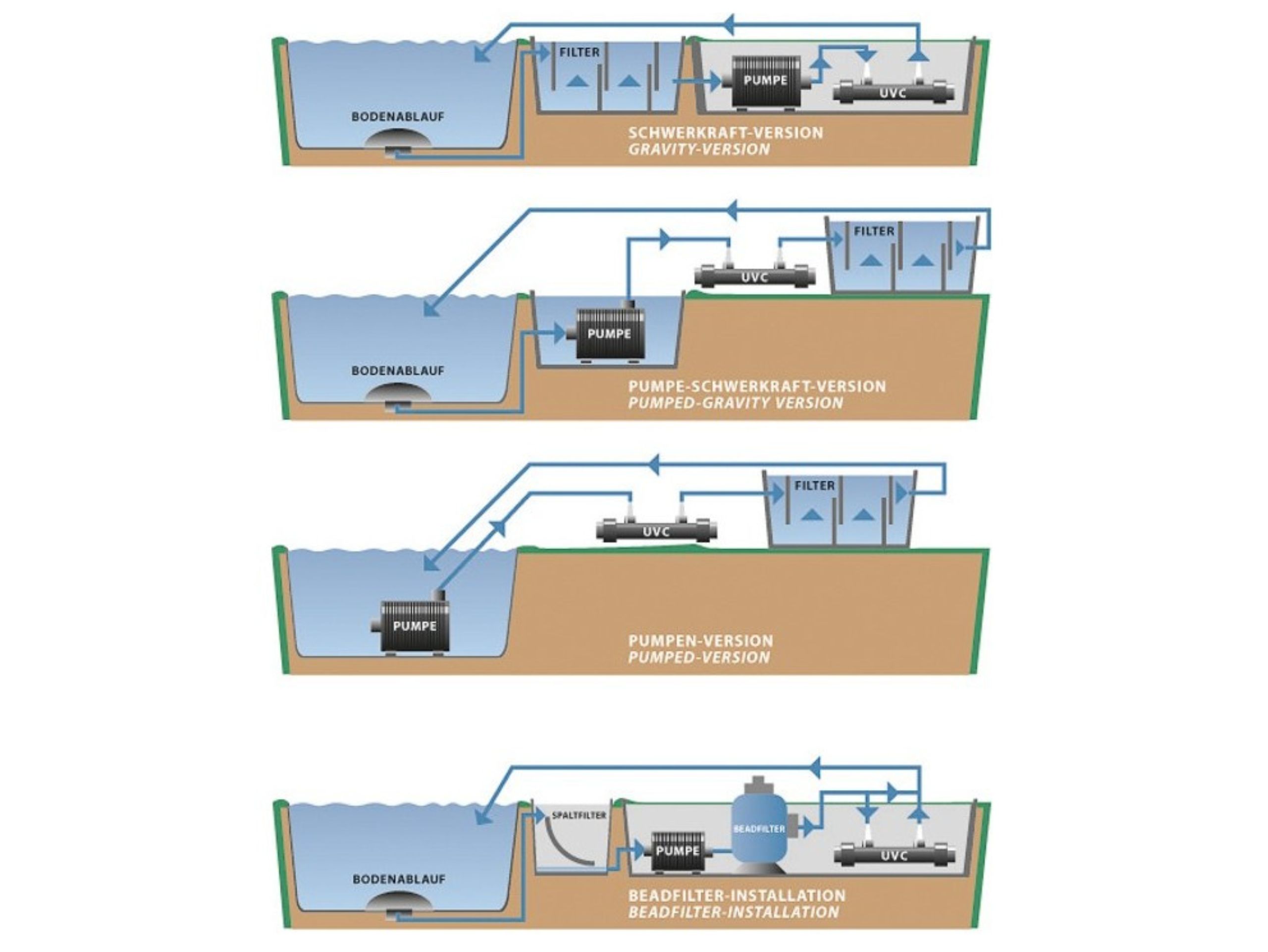 | * um eine optimale Strömung im Teich zu erhalten empfehlen wir eine Umwälzung des Teiches von 1 x pro Stunde. Reicht die Filterpumpe nicht aus ist eine zusätzliche Strömungspumpe im Teich zu installieren! | ||||