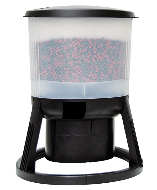 Der automatische Futterautomat von Evolution Aqua wurde für Teiche und Koiteiche entwickelt. Er kann so programmiert werden, das die Futterpellets in zeitgesteuerten Intervallen (1-6 mal täglich) in den Teich befördert werden. Die Besonderheit ist, dass der Koiteich-Futterautomat am Teichrand stehen kann und keine Aufhängung oder Verlängerung benötigt, da das Futter nicht fallen gelassen wird, sondern in den Teich geschleudert wird (bis zu 3 Meter weit).