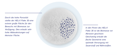 Die poröse Struktur stellt eine extrem große Fläche für den Bewuchs mit Biomasse zur Verfügung. In seinen Poren ist die Biomasse vor Abrasion geschützt. Die flache Geometrie erlaubt eine optimale Versorgung mit Sauerstoff und Nährstoffen. Durch die Größe können die Chips leicht durch Rück-haltesysteme in den Becken zurückgehalten werden.