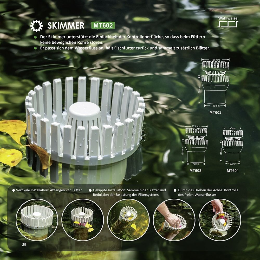 Wenn der Skimmer vertikal eingebaut wird, hält er Futter zurück. Bei einer schrägen Installation hält er Blätter und große Verunreinigungen zurück.
