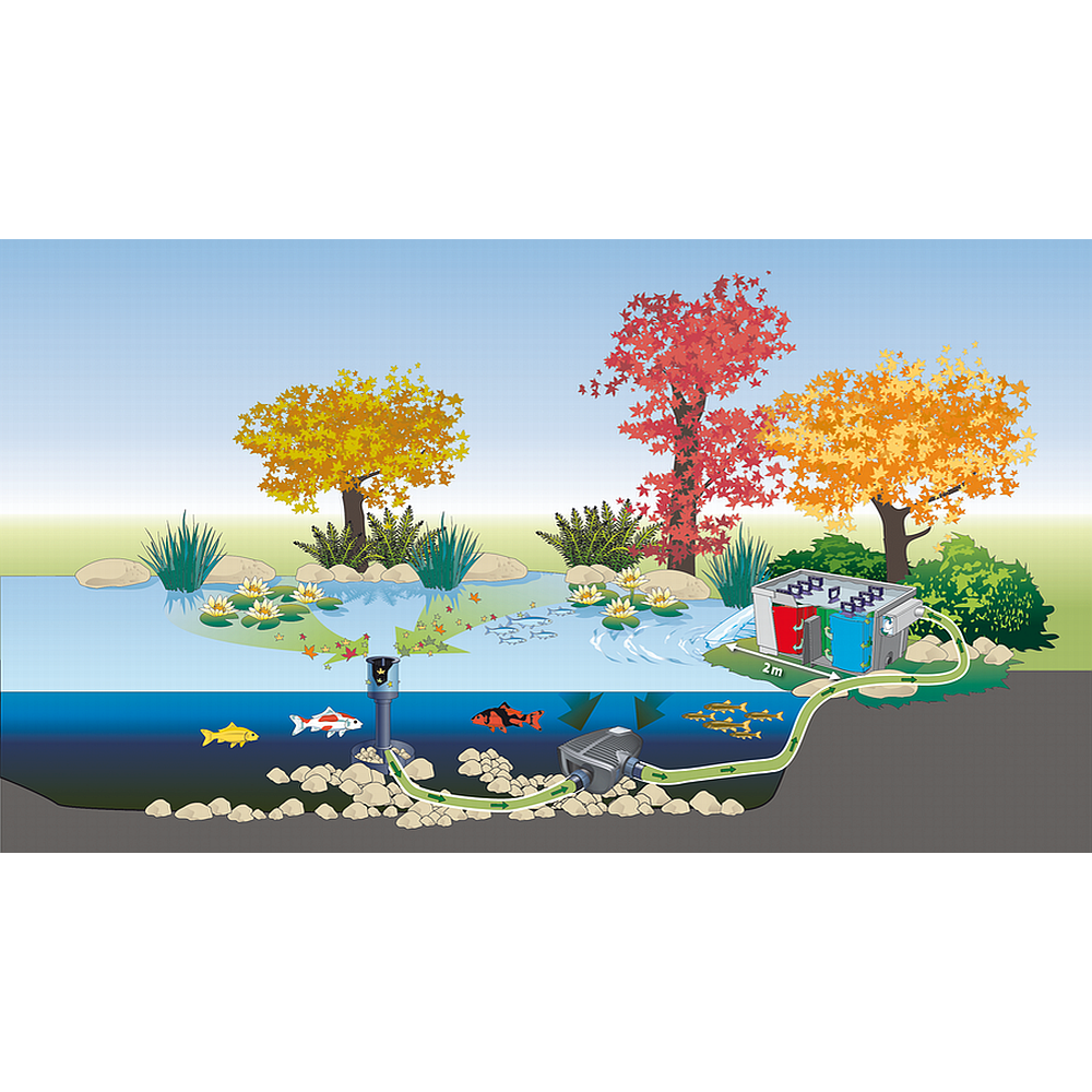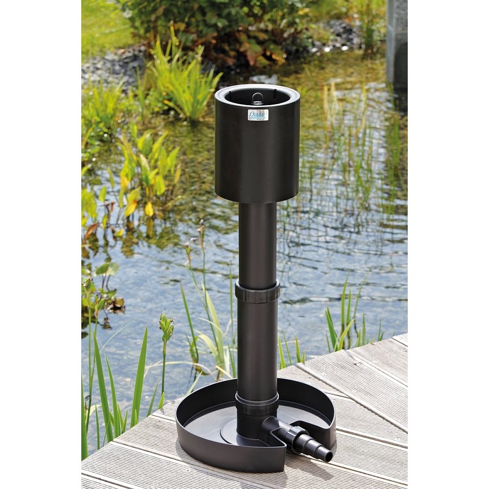 Der Oase Standskimmer kann in gepumpten Teichen installiert werden um die Teichoberfläche von Schmutzpartikeln und Blättern zu befreien. Die Installation erfolgt an einer Pumpe mit einer Leistung zwischen 8.000 – 20.000 Liter pro Stunde. Wenn der Skimmer beschwert wird mit Steinen, dann kann der Teich auf einer Oberfläche bis zu 40 m² abgesaugt werden.