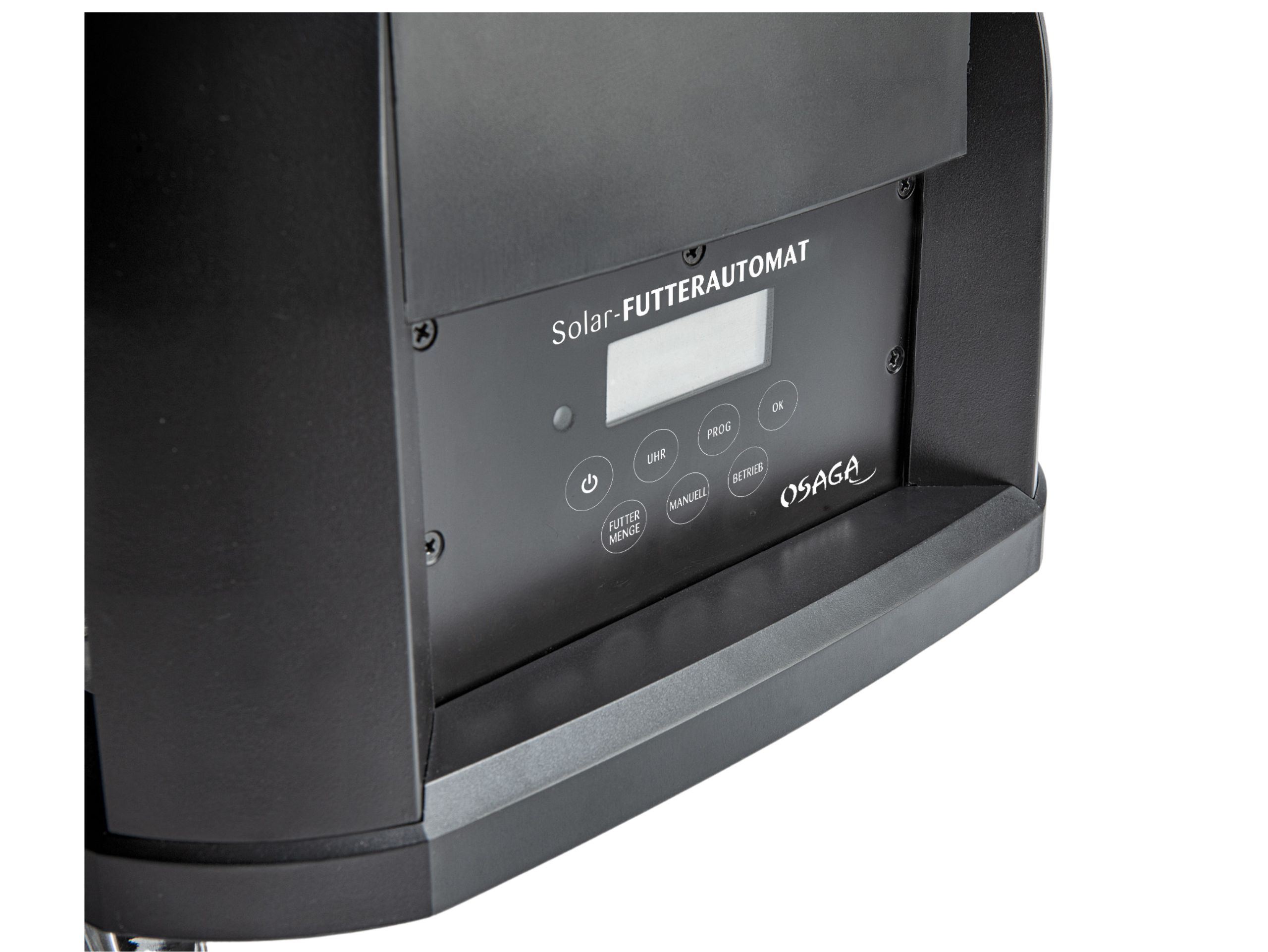 Das Solarpanel hat eine Speicherkapazität von 1.800 mAh. Hiermit kann der Betrieb auch einen Monat ohne Sonnenschein erfolgen. Das Bedienfeld mit LCD-Anzeige ermöglicht die Einstellung der Futterzeiten als auch die Futtermenge. Über das Drehrad auf der Vorderseite können zudem manuelle Fütterung ausgelöst werden. Dank der cleveren Memory-Funktion bleiben die Einstellungen auch bei vollständig entladenem Akku erhalten.