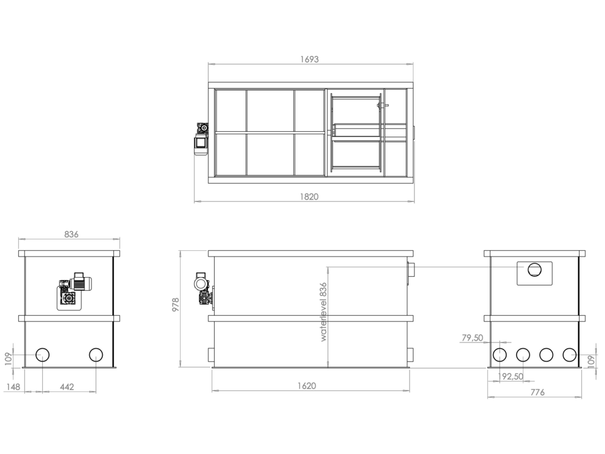 Der Filter verfügt über 4 Einläufe, 2 Abläufe und einem Schmutzablauf. Die Anschlüsse haben einen Durchmesser von 110mm, wodurch ein ausreichender Durchfluss gewährleistet wird.