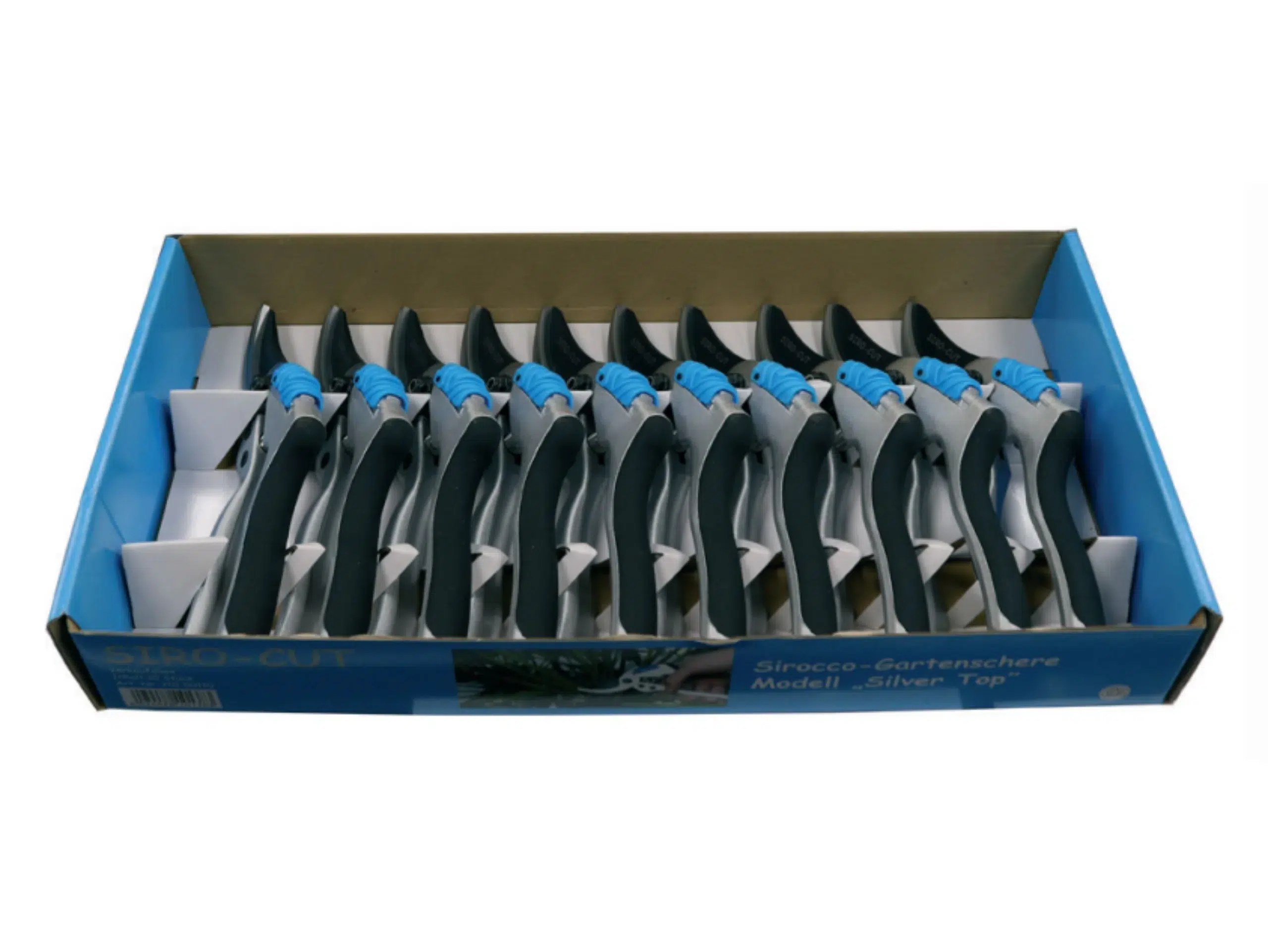 Die Sirocco Gartenschere Silver Top hat durch die Karbonklingen eine lange Standzeit und sollte in keinem Garten fehlen. Das ergonomische Design und die gummierte Oberseite ermöglichen auch längeres Arbeiten. Mittels Schiebe-Feststeller kann die Schere dauerhaft geschlossen werden um Verletzungen zu vermeiden.