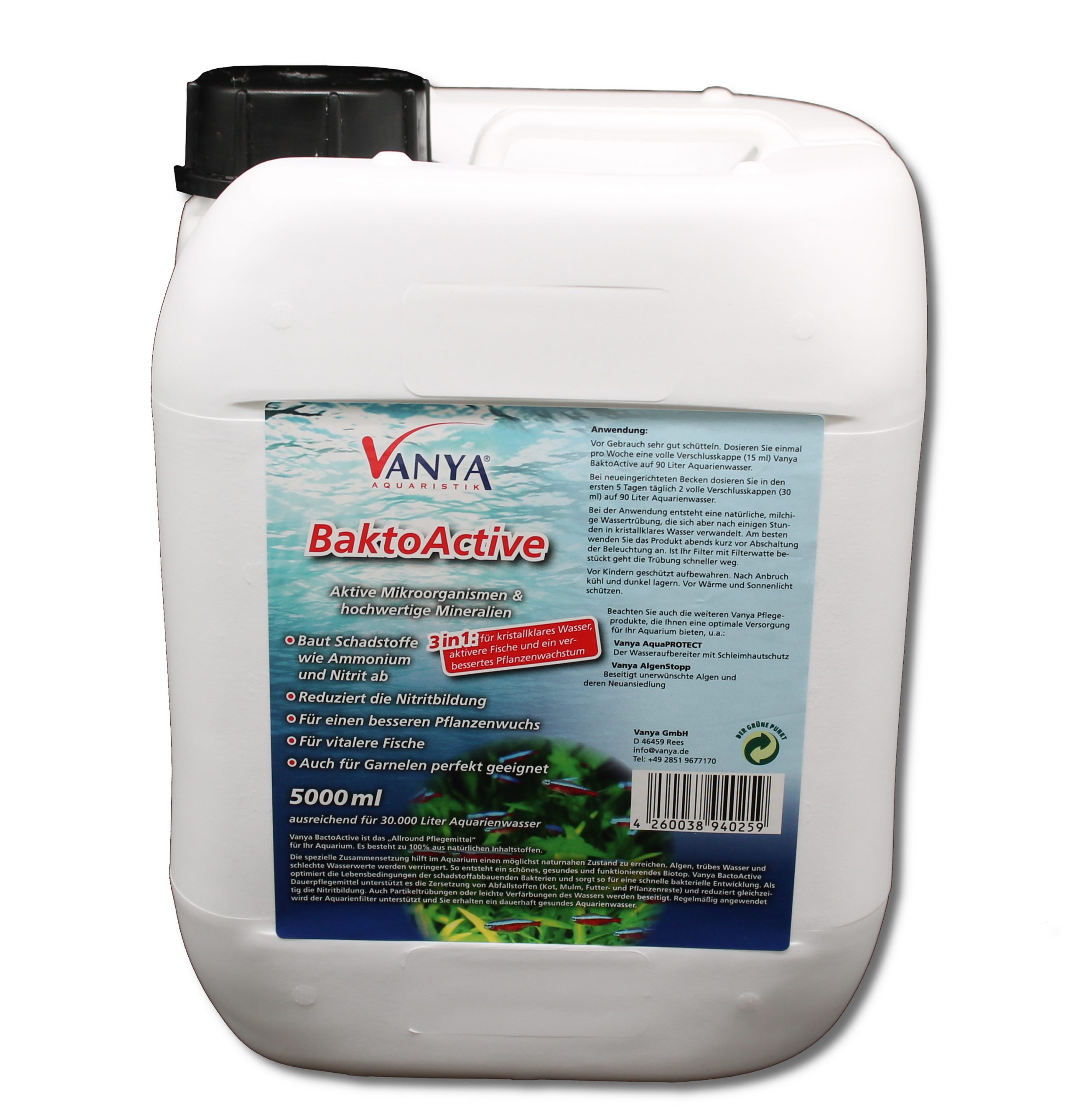 Dieses Produkt ist ein „Allround Pflegemittel“ für das Aquarium und besteht zu 100% aus natürlichen Inhaltsstoffen. Durch seine spezielle Zusammensetzung ist Bakto Active sehr effizient und hilft im Aquarium einen möglichst naturnahen Zustand zu erreichen. BaktoActive optimiert die Lebensbedingungen der schadstoffabbauenden Bakterien und sorgt so für eine rasante Entwicklung aller wichtigen Bakterien. Als Dauerpflegemittel eingesetzt unterstützt es die Zersetzung von Abfallstoffen wie z.B. Kot, Mulm und Futterresten und gleichzeitig wird die Nitratbildung reduziert. BaktoActive beugt Algenbildung und trübem Wasser vor, verbessert die Wasserwerte und schafft ein schönes und funktionierendes Biotop. Der Pflanzenwuchs wird unterstützt und die Farbenpracht und Gesundheit der Fische gefördert.