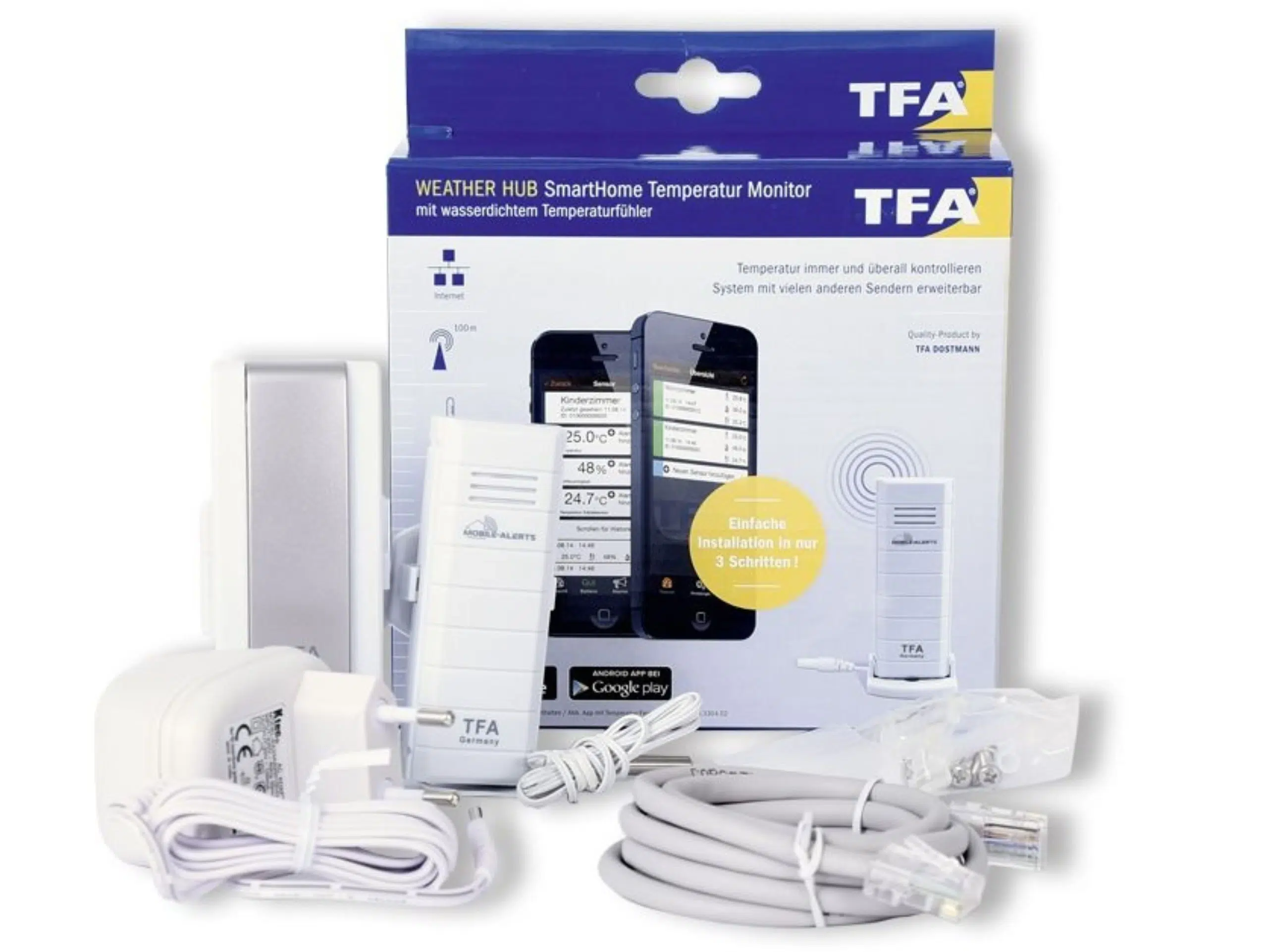 Das Set wird mit einem Gateway und einem Temperatursender mit wasserfestem Kabelfühler geliefert.